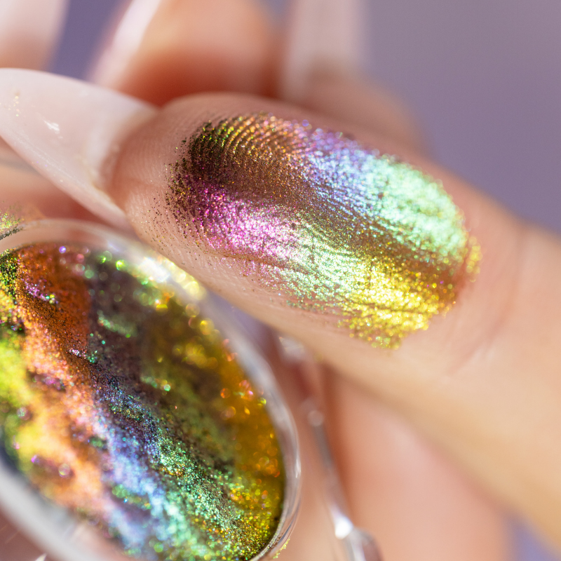 "Samba" to połączenie złota, zieleni, różu i pomarańczu o rudym odcieniu, które tworzą zachwycający efekt kameleona. Nałożony palcem daje spektakularną tęczową poświatę, a jedwabista formuła ułatwia aplikację. Cień doskonale sprawdza się także jako kolorowy rozświetlacz, dodając skórze unikalnego blasku.