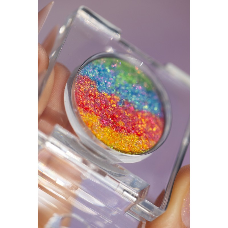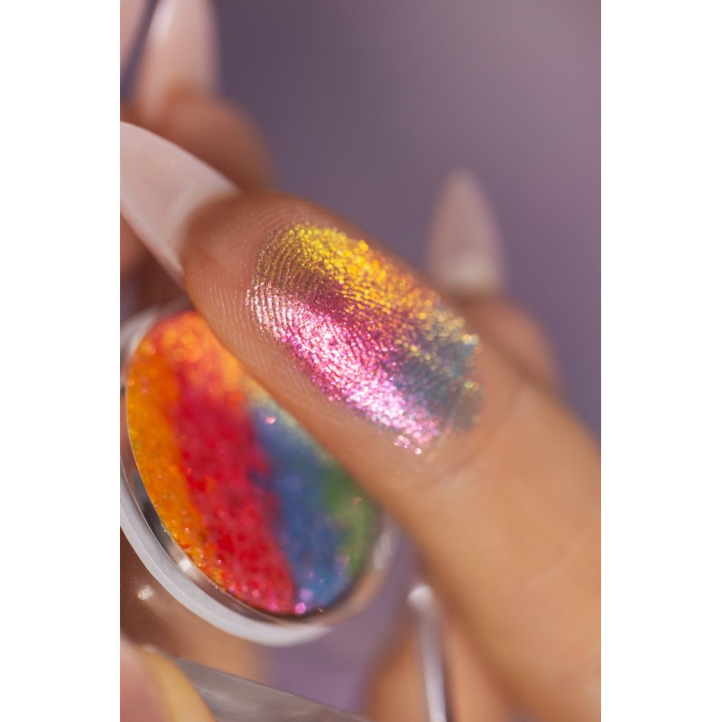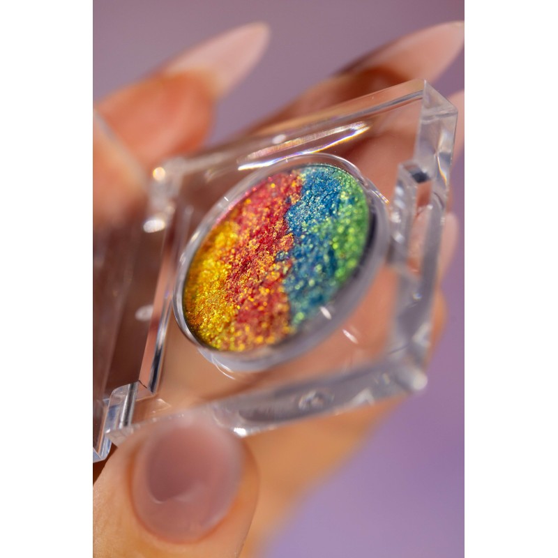 "Bachata" to wyjątkowe połączenie złota, intensywnego różu, błękitu i delikatnych zielonych refleksów. Każdy ruch powiek odsłania nową barwę, a nałożony palcem tworzy spektakularny efekt tęczy. Dzięki swojej uniwersalności sprawdzi się zarówno jako cień, jak i nietypowy rozświetlacz na kościach policzkowych czy łuku kupidyna.