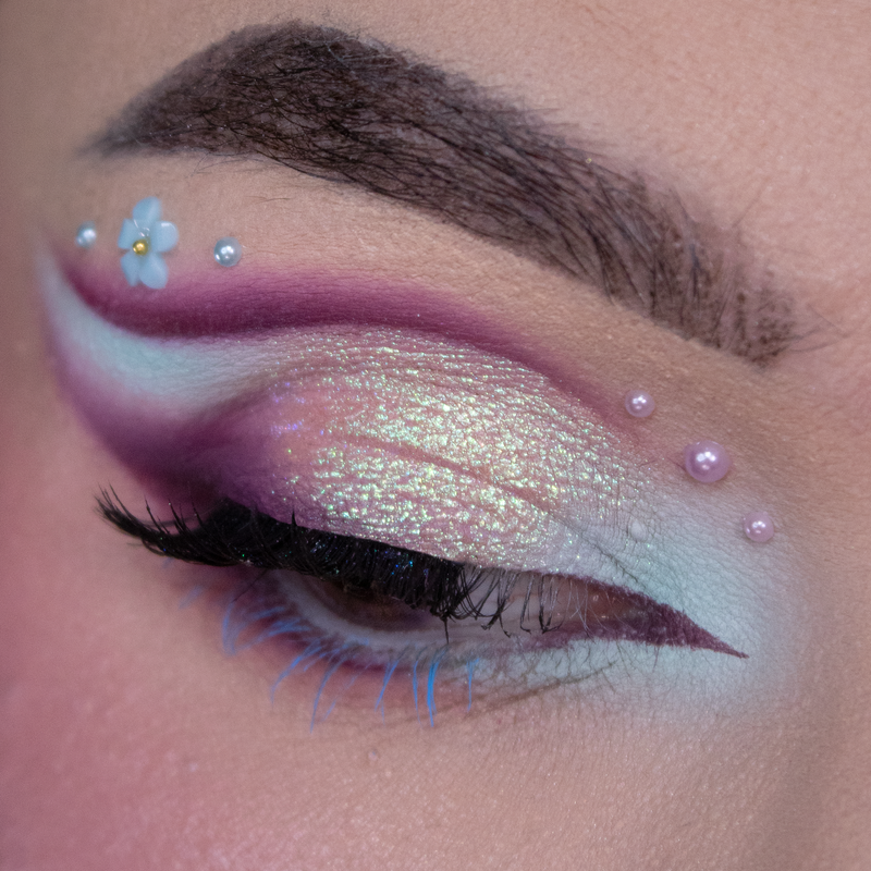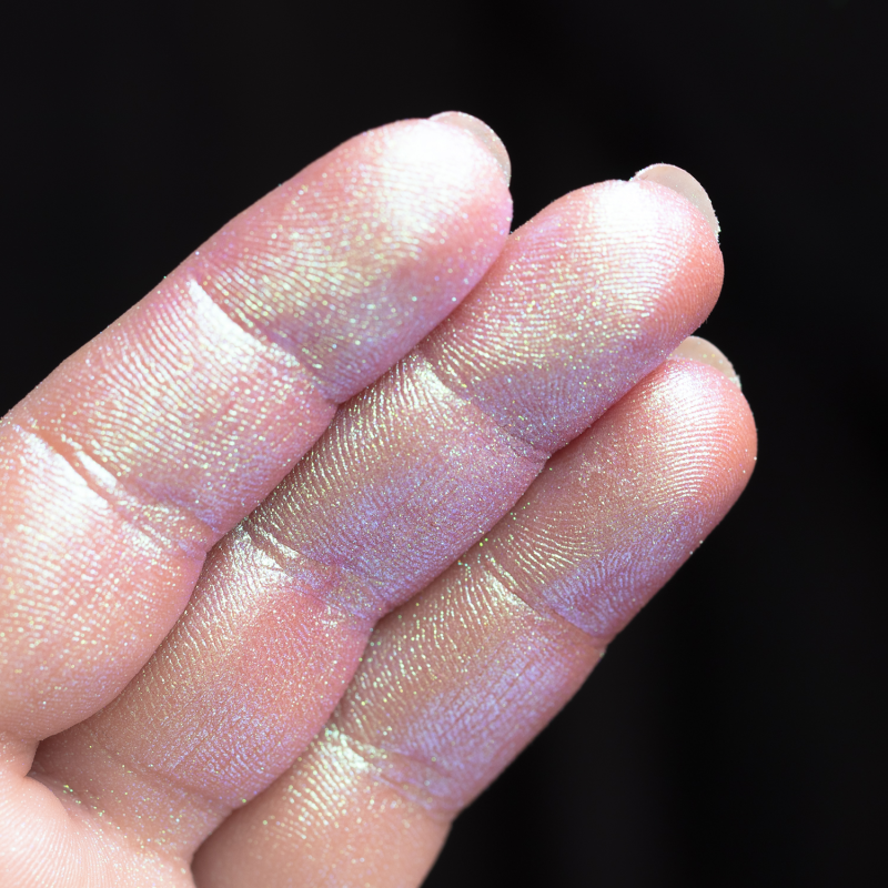 Pigment Spark przynosi delikatny brzoskwiniowy kolor z fioletowymi i złotymi drobinkami, które razem tworzą ciepły, ale olśniewający efekt na powiekach.